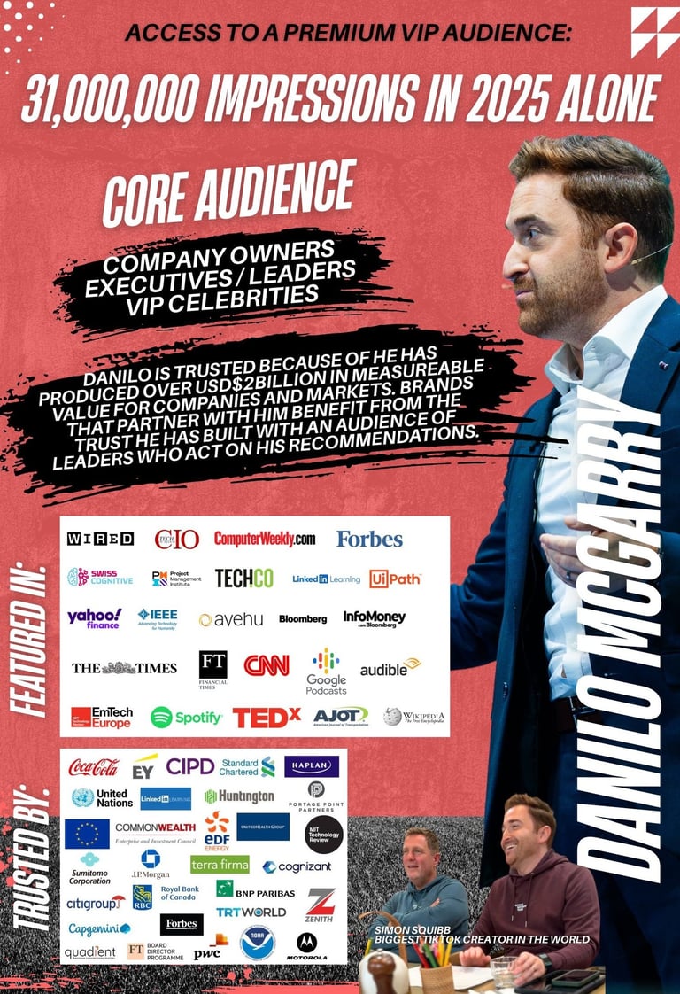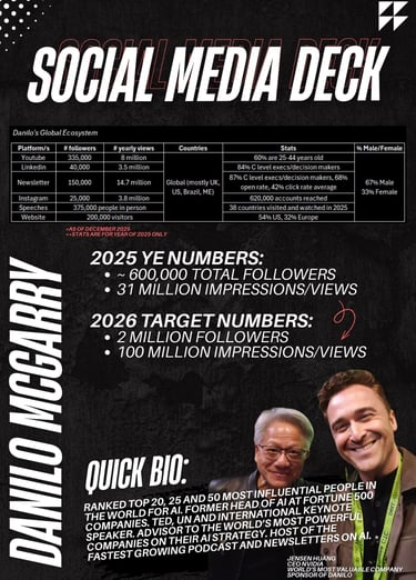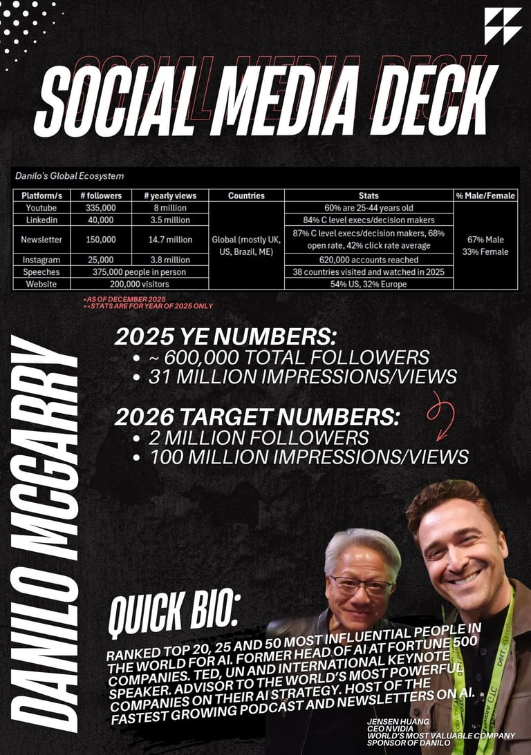I speak to an audience that brands rarely reach at scale: business owners, CEOs, C level executives, and decision makers who control real budgets. My ecosystem spans LinkedIn, YouTube, Instagram, my newsletter, and my global keynote stages. My audience trusts me because I built my credibility through decades delivering real AI transformation in the world’s largest companies, not theory.
